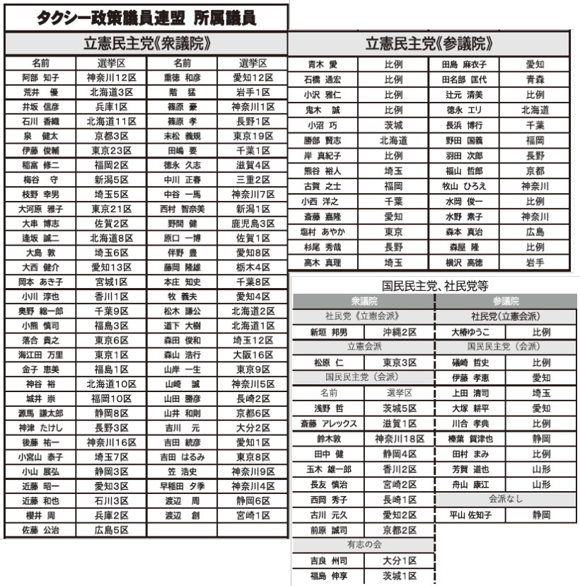 6月13日、ライドシェア阻止をテーマに、タクシー政策議員連盟(会長=辻元清美参議院議員)の総会が開催されました。立憲民主党や国民民主党の国会議員議員42人と秘書51人が参加しています。