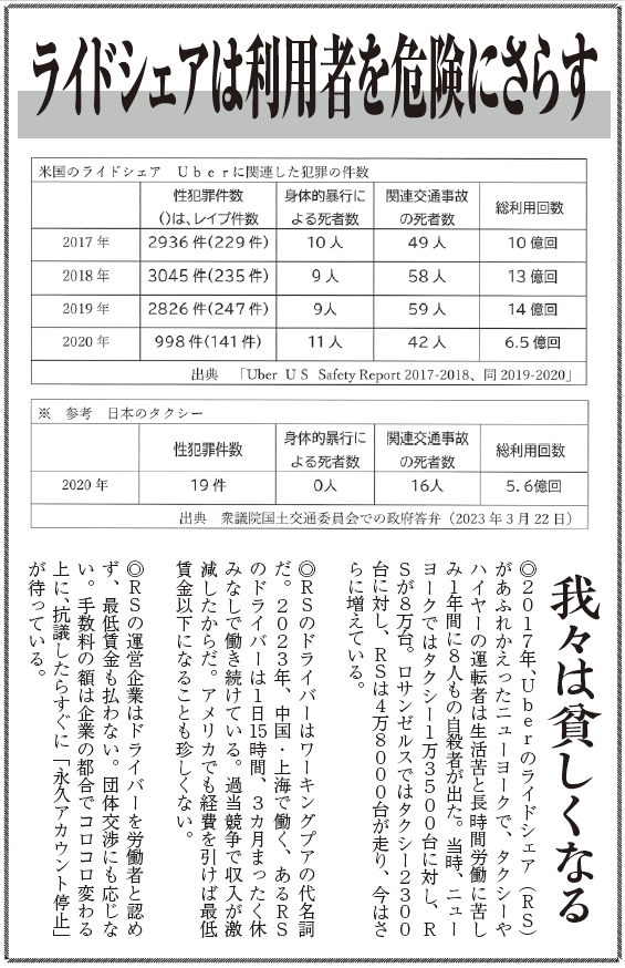 ライドシェアは危険な上に、働く者の低所得化を招きます。その弊害は世界中で証明されており、先進国の8割が禁止しています。にも関わらず、推進派は「ライドシェアが必要だ」という世論を作り上げ、政府や自治体を動かそうとしています。