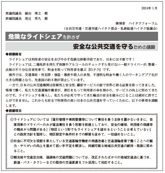 全自交労連は地域公共交通を維持し、利用者の安全と労働者の生活を守るため、全力でライドシェア阻止に向けた行動に取り組んでいますが、メディアの力に対抗することは容易ではありません。組合員一人一人の力が必要です。仲間や家族にライドシェアの危険性を伝えてください。まもなく国会への請願署名活動にも取り組みます。全国からライドシェア反対の声を上げましょう。