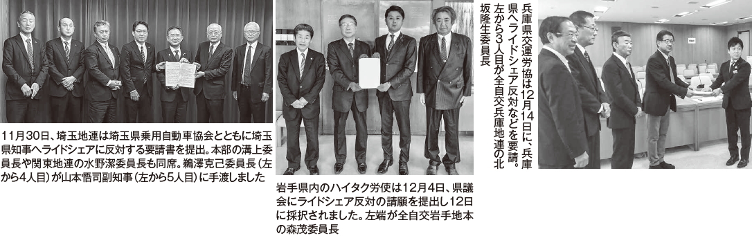 嬉しいニュースでは岩手県議会が12日、「安全・安心を無視した無秩序なライドシェアの導入に反対し地域公共交通を守る施策の推進を求める請願」を採択し、政府や国会に意見書として提出しました。さらに、埼玉や兵庫でも県への要請が行われています。自分の住む県や市長村にライドシェアを入れないよう運動を強化しましょう。