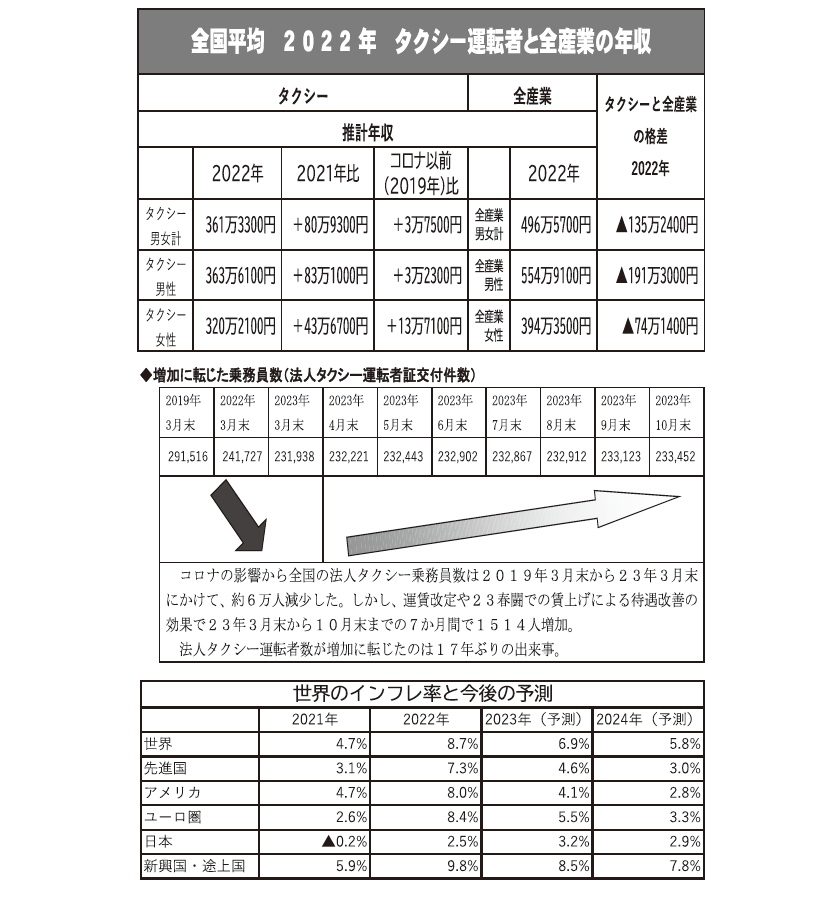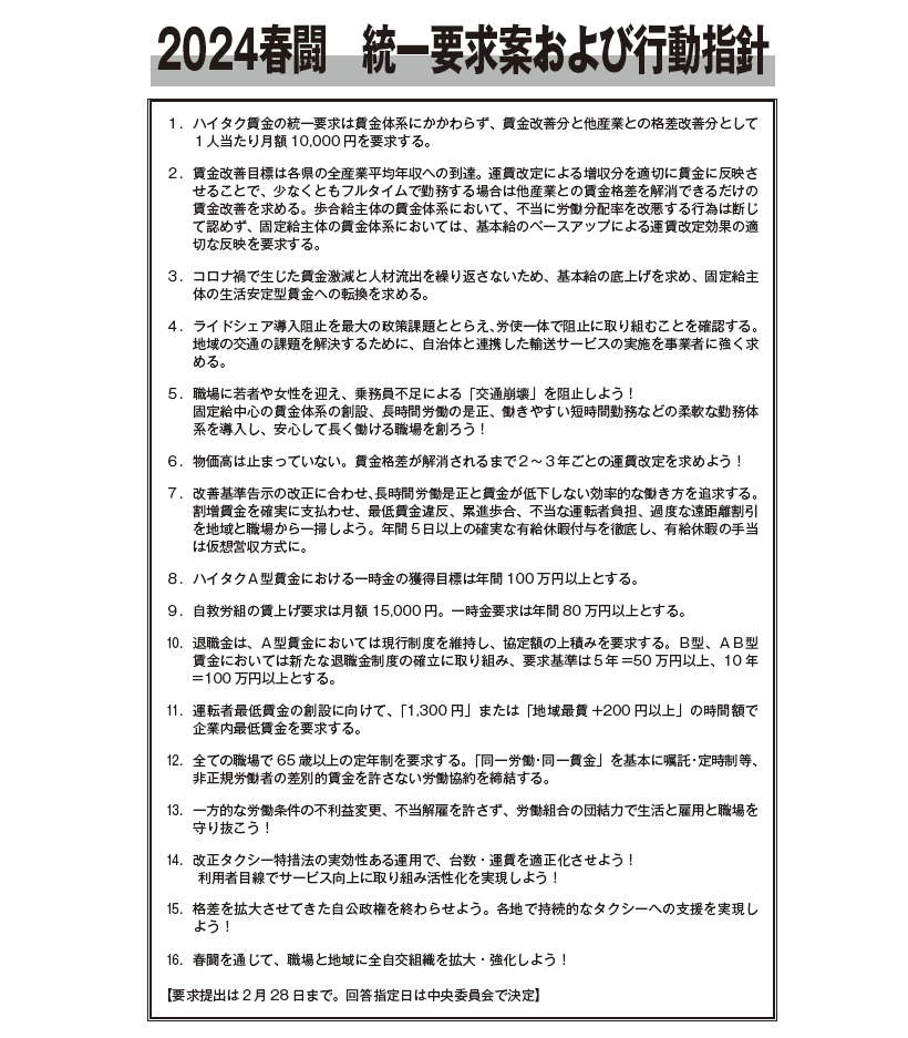 2024春闘は、ハイヤー・タクシー産業の存亡を賭けた闘いとなります。ライドシェア導入の動きが日増しに高まる中で、「タクシーが足りない、乗務員が足りない」という声をなくす取り組みが労使双方にとっての最優先かつ緊急の課題であり、そのためには魅力的な賃金・労働条件と働きやすい職場環境を実現することが必要だからです。離職者を減らし、新たな仲間を職場に招きいれ「自分たちの住む場所にライドシェアは入れない、タクシーが地域公共交通を守る」と、自信をもって断言できる状況を労使で作り上げること、それが2024闘の最大の課題です。
