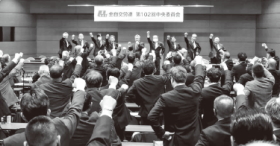 中央委員定数55人中、出席35人委任20人、役員38人中、出席35人委任3人で中央委員会の成立が確認されました。