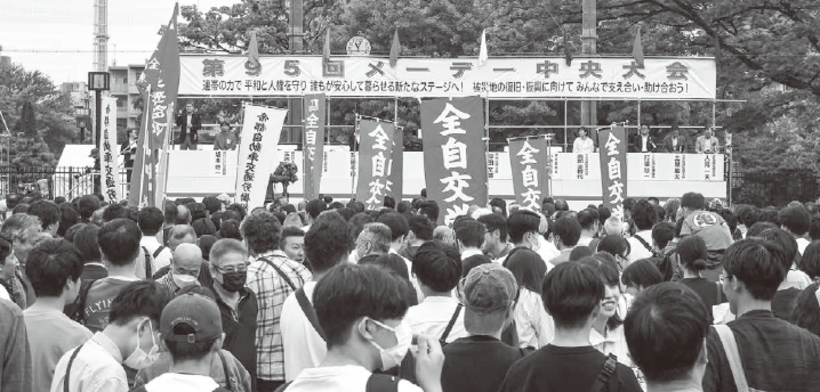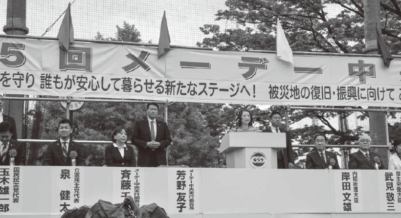 連合は「連帯の力で平和と人権を守り 誰もが安心して暮らせる新たなステージへ!」「被災地の復旧・復興に向けてみんなで支え合い・助け合おう」をメーデーのスローガンに掲げています。