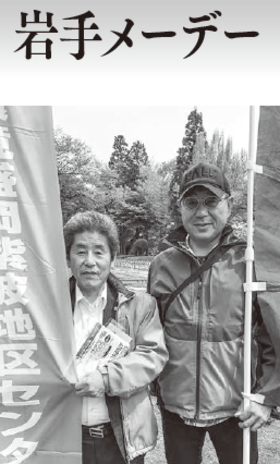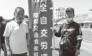 連合岩手は5月1日、盛岡城址公園多目的広場で、第95回岩手県中央メーデーを開き750人が集結しました。全自交からは、岩手地本の森茂委員長(写真左)らが参加し、全自交岩手の旗を掲げています。