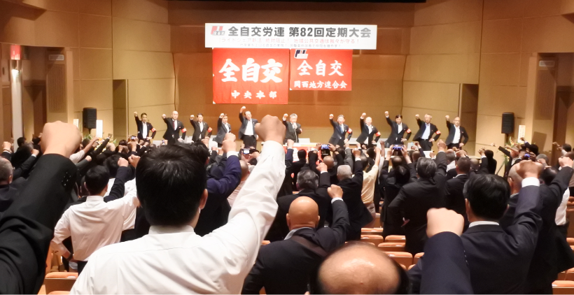 開催地となった兵庫地連と関西地連の皆さまの献身により、大会は成功裏に幕を閉じ、最後に「公共交通を我々の手で守るため、ライドシェア新法制定阻止に向けて、全自交労連団結してガンバロウ」の掛け声の下、参加者全員が明日からの闘いに向け決意を固めました。