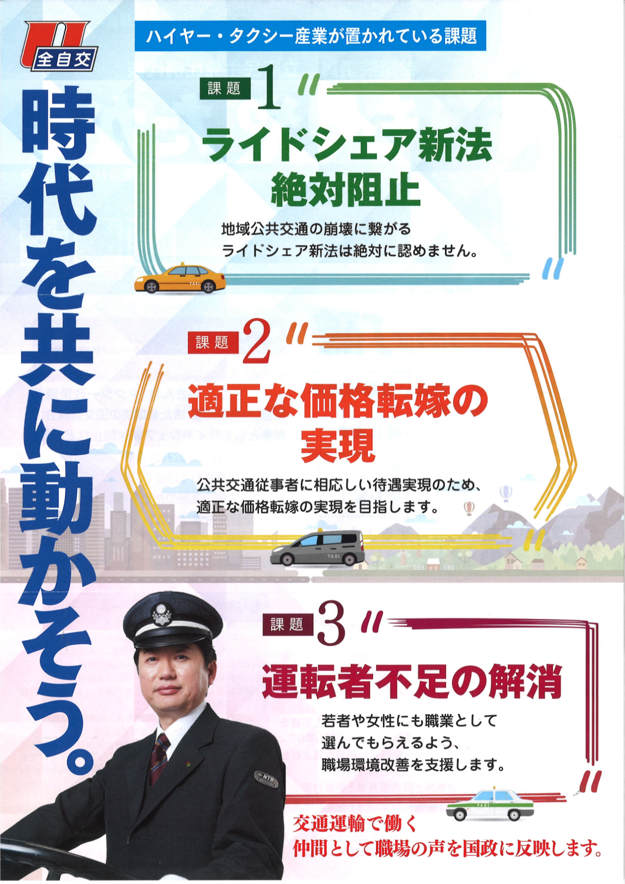 これまで全自交労連は月間原資1万円を柱とする賃金要求を掲げてきましたが、タクシーと(歩合給中心の)ハイヤーにおいて月額8%・2万8000円の賃上げ要求を掲げ、2025春闘を闘います。その実現に向け、価格転嫁(運賃改定や迎車料金)と公的支援の獲得を強く求めていきます。固定給中心のハイヤーでは6%・21000円、自教では月額1万8000円+年間一時金100万円以上を要求します。