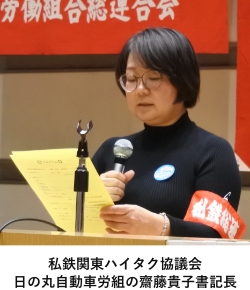 連合の清水事務局長は「連合はライドシェア新法が導入されることのないよう引き続き取り組む」と述べ、交運労協の慶島事務局長は「日本維新の会は、しょうこりもなく『ライドシェア新法』を提出すると聞くが、断固反対である。ハイタクだけの問題でなく、人流・物流に関わる総ての法律と雇用法制への破壊攻撃と位置づけ、交運労協は組織全体で闘う」と強固な連帯を示しました。