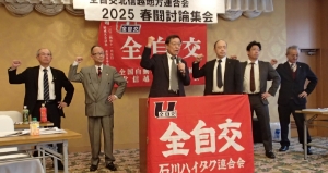 昨年11月に結成された北信越地連は、能登地域の復興支援を兼ね、石川県志賀町で2月25、26日に春闘討論集会を開きました。震災で被害を受けた石川交通労組七尾支部の受川裕一支部長は、全国からの支援に感謝し地域交通を守り抜く決意を表明。石橋剛委員長は改めて復興への思いを述べ、春闘勝利に向け、団結を呼び掛けました。各県地連の代表者が春闘要求を説明し、各地の公共・日本版ライドシェアの状況を報告。全自交本部の津田光太郎書記次長が春闘課題について講演しました。