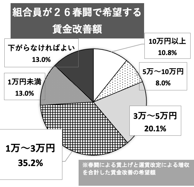 これらの事を踏まえハイヤー・タクシーの26春闘における賃金改善の要求を月額2万8千円・8%以上(運賃改定等による増収反映分を含む)、自教については月額1万8千円以上とし、都道府県ごとの全産業平均賃金との格差是正を目標とすることで地域間格差との整合を図りつつ賃金改善を目指し闘う。