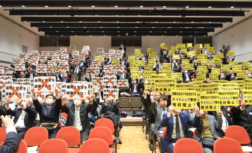 ハイタク労働者の待遇を向上させ、地域公共交通と雇用を守り抜き、ライドシェアなど不要な状況を作りだそう。今こそ長年にわたったライドシェア問題にピリオドを打つ時だ。私たちは公共交通で働く者の使命と矜持を胸に、全力でライドシェア新法絶対阻止のために闘うことを決議する。
