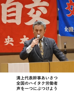 主催者としてあいさつした溝上泰央ハイタクフォーラム代表幹事(全自交労連中央執行委員長)は、「今年は、戦後80年、阪神淡路大震災から30年、といった節目の年であり、亡くなられた方に哀悼の意を表するとともに、被災された皆様に心よりお見舞いを申し上げておきたい」と冒頭で述べ「世界で起きている様々な紛争は、原油を始め、あらゆる物の高騰を引き起こし、アメリカではトランプ大統領が再び誕生した。アメリカンファーストを声高に訴え、特例の無い関税を課す姿勢は、大国としての余裕が見えず、今後の日本の経済においてもどのような影響が及ぶか、しっかりと注視していかなくてはならない」と発言しました。