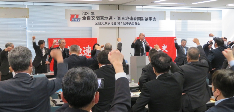 関東地連と東京地連は2月13日、都内で合同の春闘討論集会を開き、春闘方針や統一要求を確立しました。。全自交労連の方針に基づいた月額2万8000円の要求額について、関東地連の水野潔委員長は「全単組が高い要求を出して、事業者と協議を」と呼び掛け、東京地連の内田亨委員長は「この要求金額の意味をしっかりと理解して交渉を。経営者が真剣に考なければならない時代がきた」と述べました。